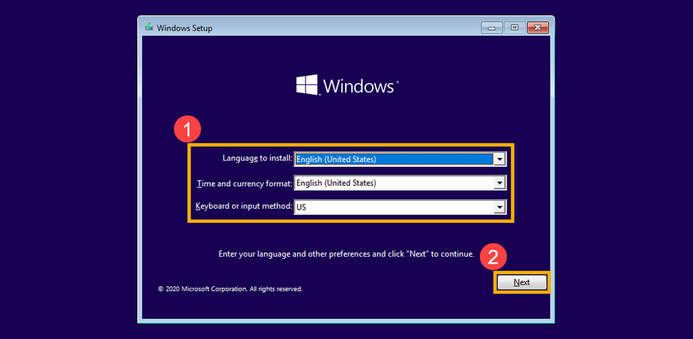 Lúc này, máy sẽ tự động mở trình cài đặt Windows 10. Chọn ngôn ngữ, định dạng thời gian, và kiểu bàn phím phù hợp rồi nhấn Next.