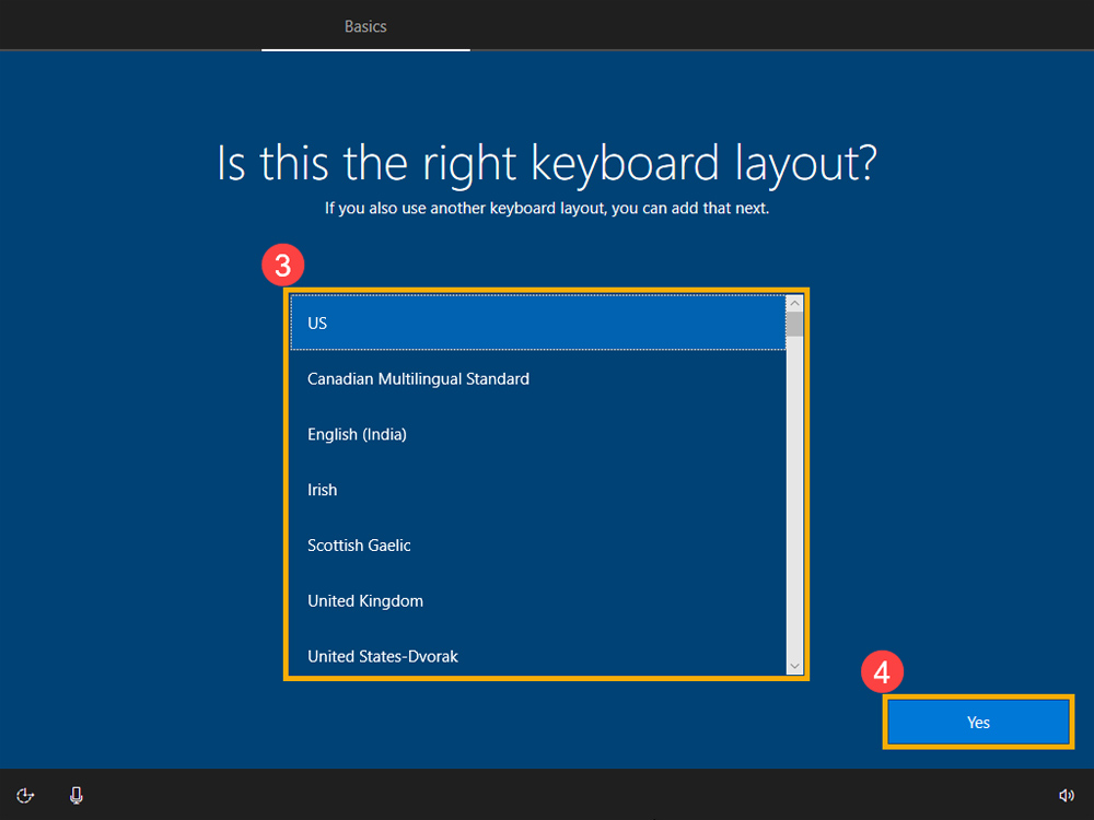 Keyboard Layout bạn chọn là US, sau đó chọn Yes.