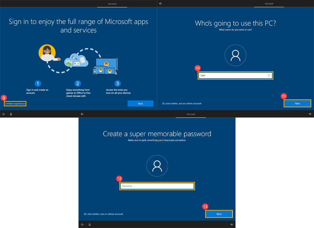 Chọn Limited experience và tiếp theo nhập tên người dùng & mật khẩu cho tài khoản offline