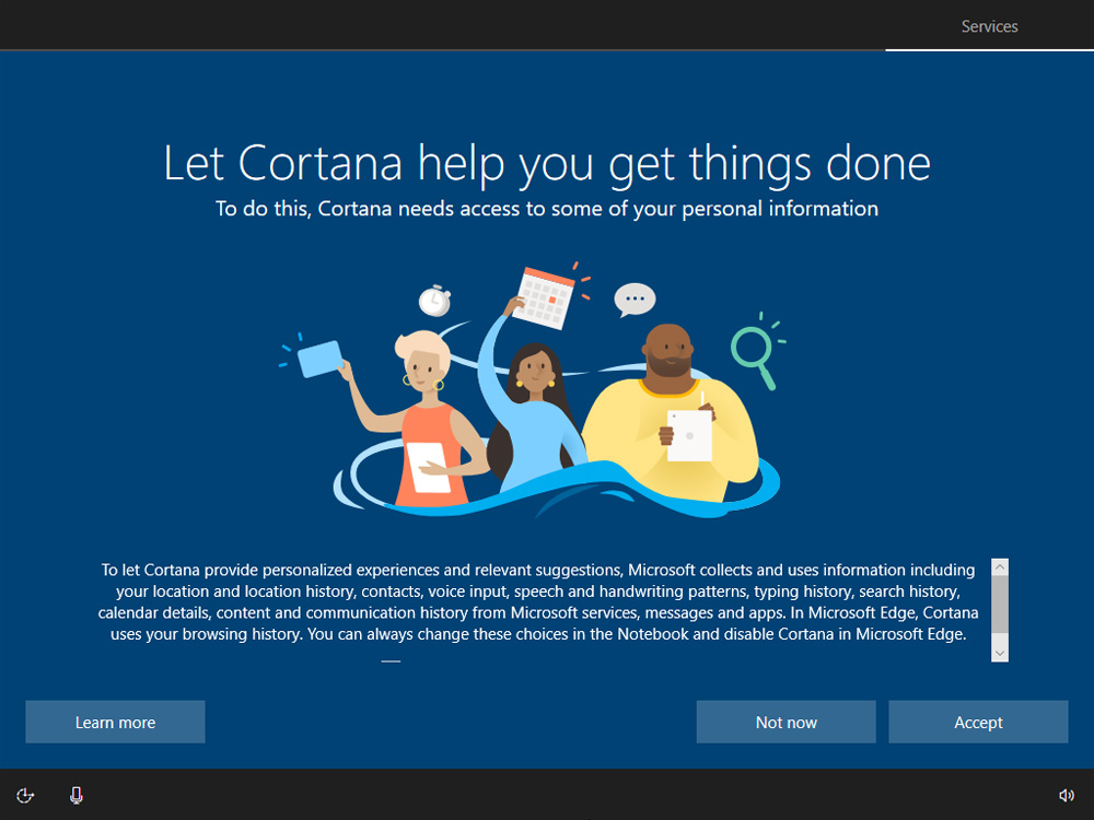 Chọn No để bỏ qua việc Microsoft sử dụng lịch sử hoạt động của bạn. Sau đó chọn Not Now để bỏ qua cài đặt hỗ trợ ảo Cortana.