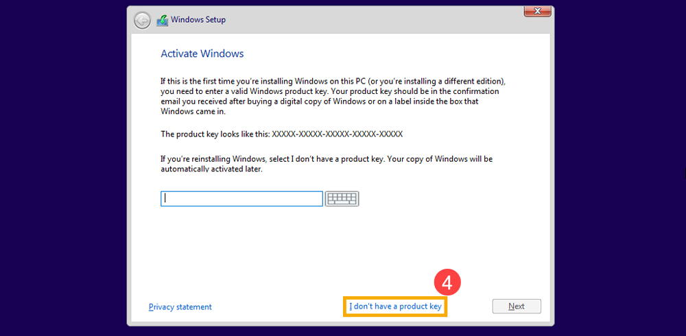 Tại mục Active Windows, bạn chọn I don’t have a product key và ấn Next.