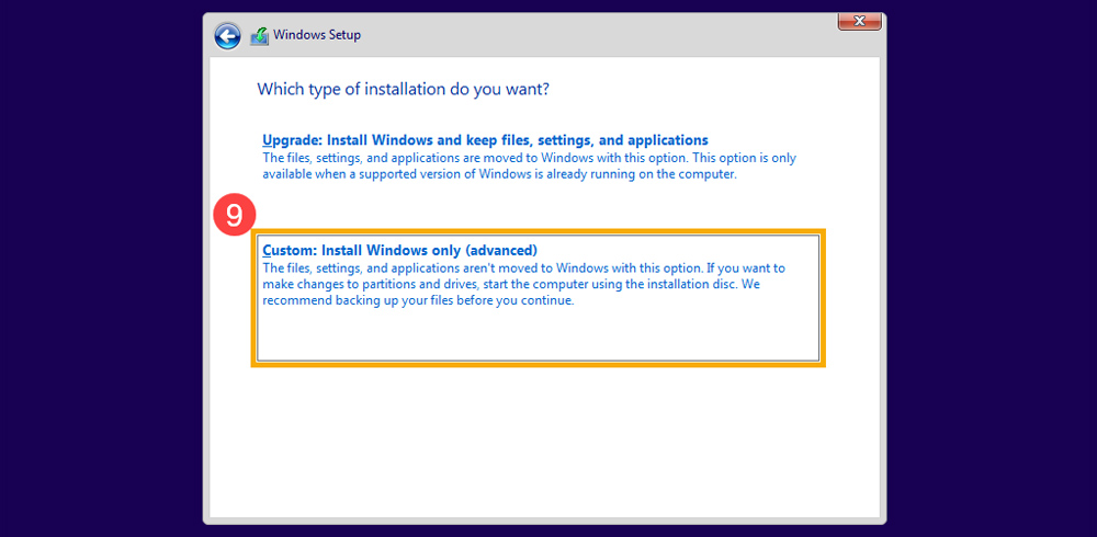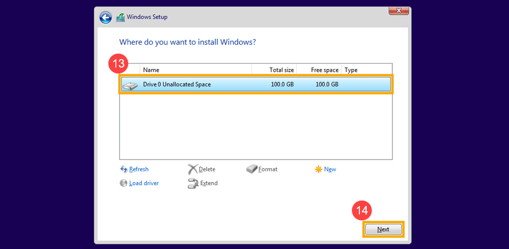 Sau khi thực hiện xong, ổ cứng được chọn sẽ tồn tại ở dạng Unallocated Space, hãy chọn ổ cứng đó và click Next để tiếp tục việc cài đặt