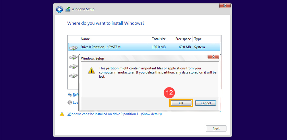Bạn sẽ thấy một danh sách ổ cứng trên máy tính, lúc này bạn cần xác định được ổ đĩa để cài Win để làm trống. Thao tác này cần cẩn thận để tránh xoá sai dữ liệu.